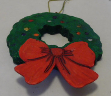 Christmas wreath has green background; red ribbon; red, blue, silver and gold dots. Ornament has gold cord hanger