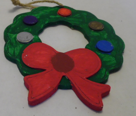 Christmas wreath has green background; red ribbon; red, blue, brown and silver round areas. Ornament has manila cord hanger