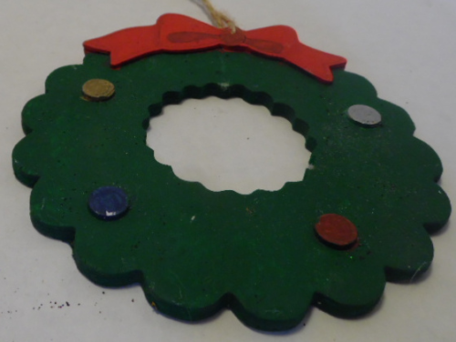 Christmas wreath has green background; red ribbon; silver and red round areas. Ornament has manila cord hanger