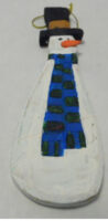 Snowman has black eyes, carrot nose. Snowman is wearing black hat with brown band, blue and green scarf. Ornament has gold cord hanger
