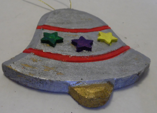 Bell has silver body; gold ringer; red ribbon stripes; green, purple and yellow stars. Ornament has gold cord hanger