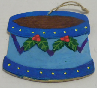 Drum has brown top, light blue center, darker blue top and bottom edge with yellow dots; blue chevron strip with mistletoe leaves and beads. Ornament has manila rope hanger