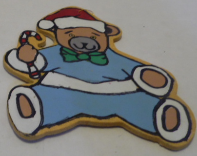 Teddy bear with grey face is wearing Santa hat, green bow tie and blue outfit with white trim. Teddy bear is holding candy cane. Ornament has gold cord hanger