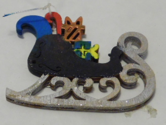 Wooden sleigh has silver runners, black body. Sleigh has blue pack, red candy cane, gold gift box, green gift box with yellow ribbon. Ornament has fishing line hanger