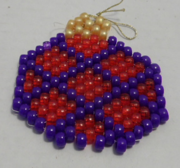 Woven ornament has purple edge and crisscross, red centers, yellow top. Ornament has gold cord hanger