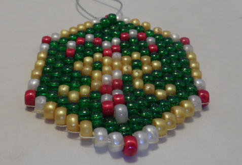 Woven ornament has red and white beads in candy cane with gold bow at center, green background; gold, white and red beads form edge. Ornament has gold cord hanger