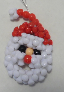 Woven ornament is Santa made with white tri-beads, red round bead mouth and hat, flesh face.  Ornament has cord hanger