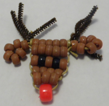 Woven ornament reindeer is made with brown bead body and ears; black eyes; red nose; pipe cleaner antlers