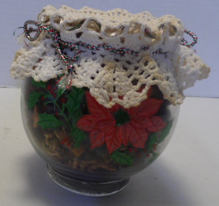 Round clear glass bowl with poinsettia flower painted on it; off-white lace top is held in place with red/silver/green rope.