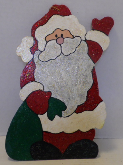 Santa is wearing red suit with white trim; black belt and boots. Santa is holding green sack Entire ornament is covered in glitter paint.